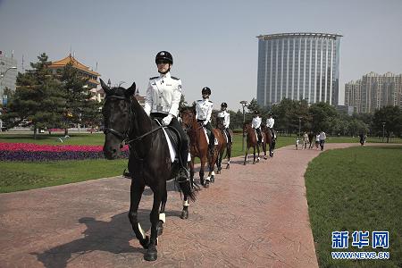 7月12日,女骑警在内蒙古包头市银河广场执行巡逻任务。当日,内蒙古首支女子骑警队在包头市首次亮相。该女子骑警队于今年4月开始组建训练,共有女骑警10名,平均年龄23岁。今后,她们将主要承担指挥疏导交通、协助警务、大型活动礼仪警卫等任务。